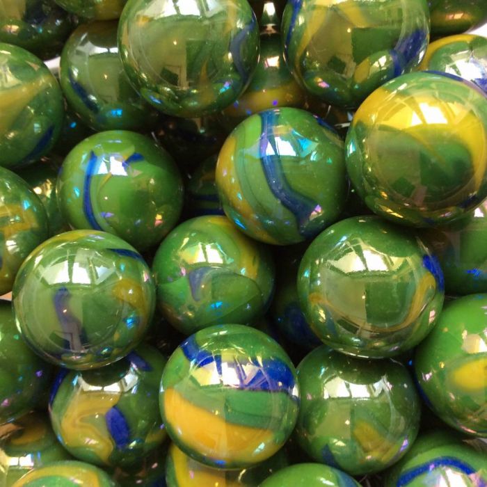 Ondoorschijnend groene knikker met gele en donkerblauwe strepen. Deze knikkers zijn afgewerkt met een parelmoerglans.