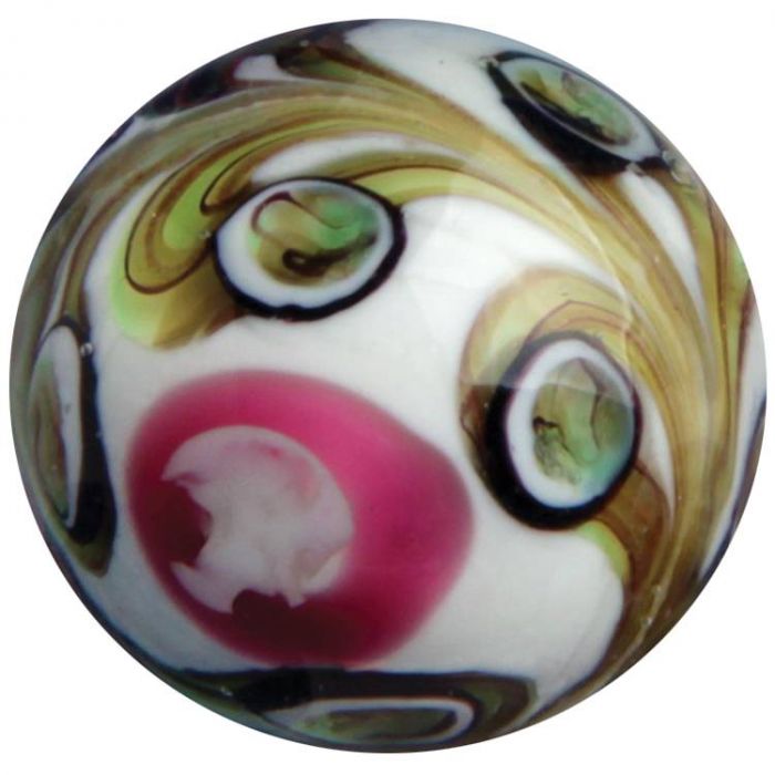 Handgemaakte knikker met een kern van wit glas. Sierlijk afgewerkt met stippen en sliertjes.