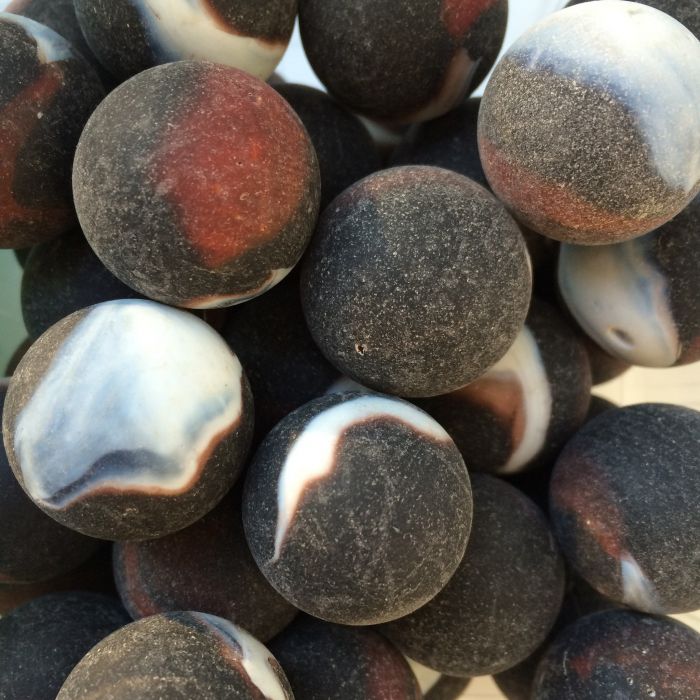 Deze stoere bonk heeft een mat oppervlak en is vervaardigd uit ondoorzichtig zwart glas dat is afgewerkt met witte en rode wervelingen.