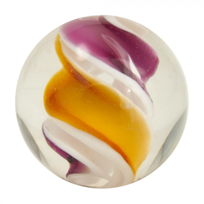 Deze handgemaakte knikker is doorzichtig en heeft in het midden een spiraal in de kleuren wit, geel en roze.