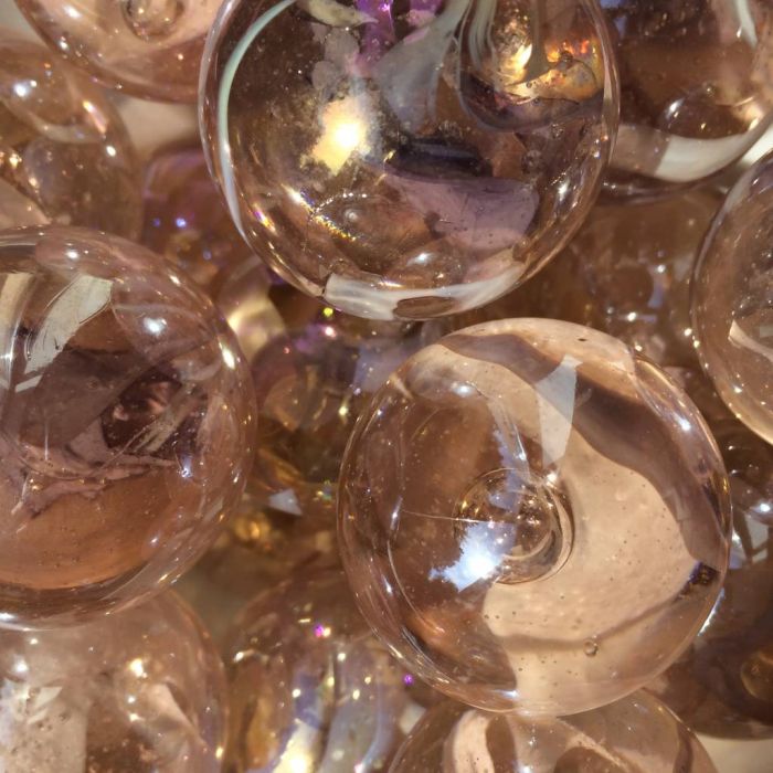 Grote knikker van transparant roze glas afgewerkt met witte slierten op en door de knikker.