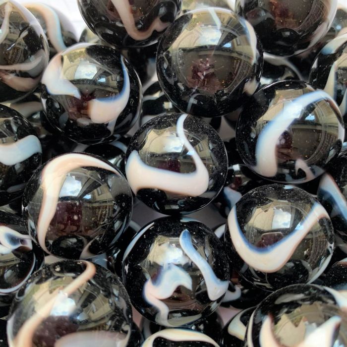 Ondoorschijnend zwarte knikker, afgewerkt met een witte slierten.