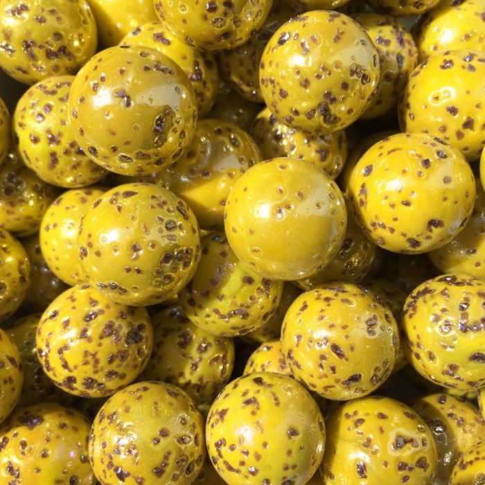 Ondoorschijnend gele knikker afgewerkt bruine glassplinters die in het oppervlak zijn gesmolten. Hierdoor heeft de knikker een oneffen, ruw oppervlak.