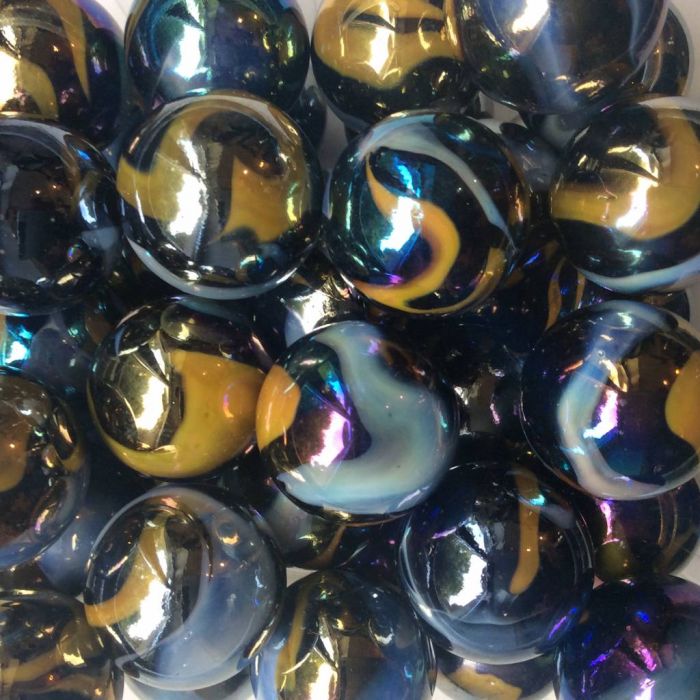 Ondoorschijnend zwarte knikker met witte en gele llijnen over het oppervlak. Deze knikkers zijn afgewerkt met een iriserende coating.