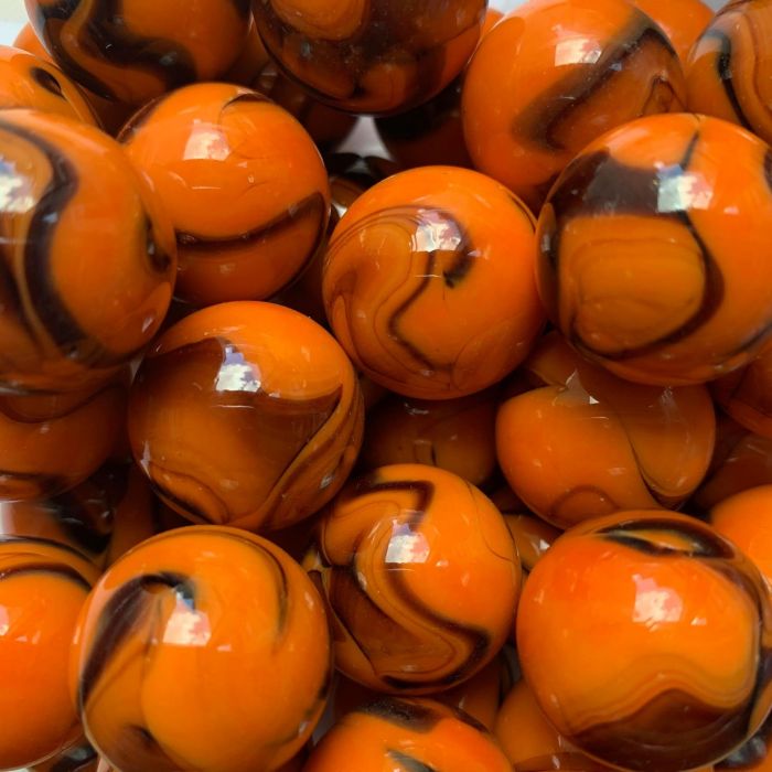 Ondoorschijnend oranje knikker afgewerkt met zwarte slierten.