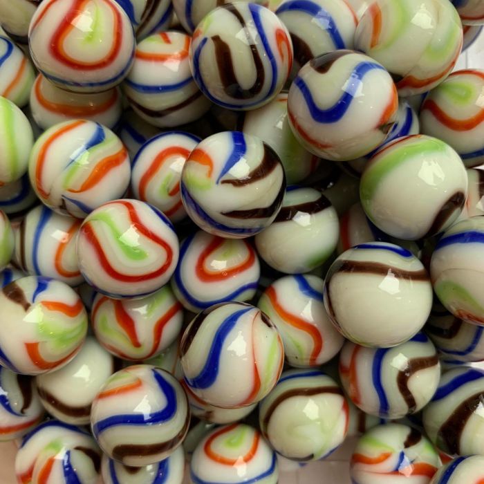 Ondoorschijnend witte knikker met dikke oranje, bruine, blauwe en groene slierten over het oppervlak.