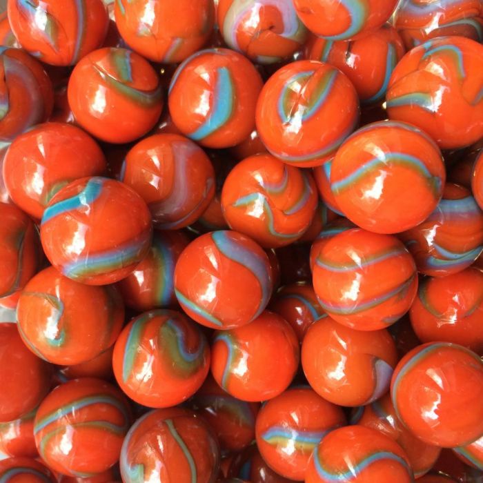 Ondoorschijnend oranje knikker met blauwe slierten over het oppervlak.