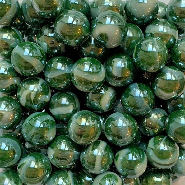 Groene knikker met witte slierten. Deze knikker is afgewerkt met een mooie parelmoerglans.