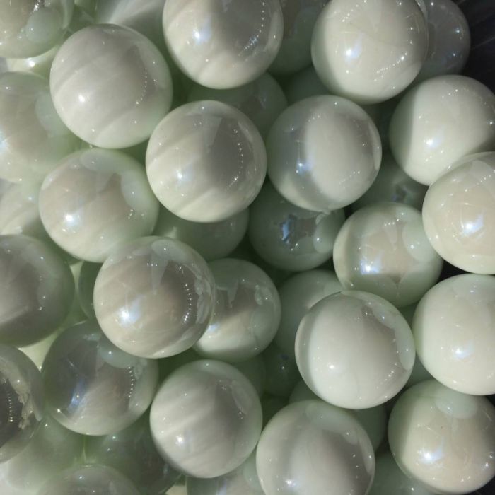 Ondoorschijnend witte knikker afgewerkt met een parelmoerglans.