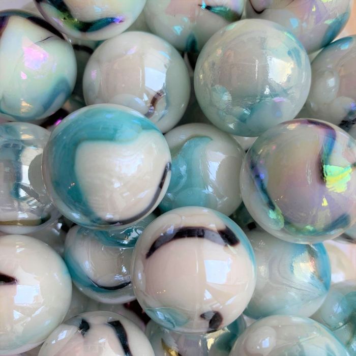 Ondoorschijnend witte knikker met lichtblauwe vlekken en zwarte strepen. Deze knikkers zijn afgewerkt met een parelmoerglans.