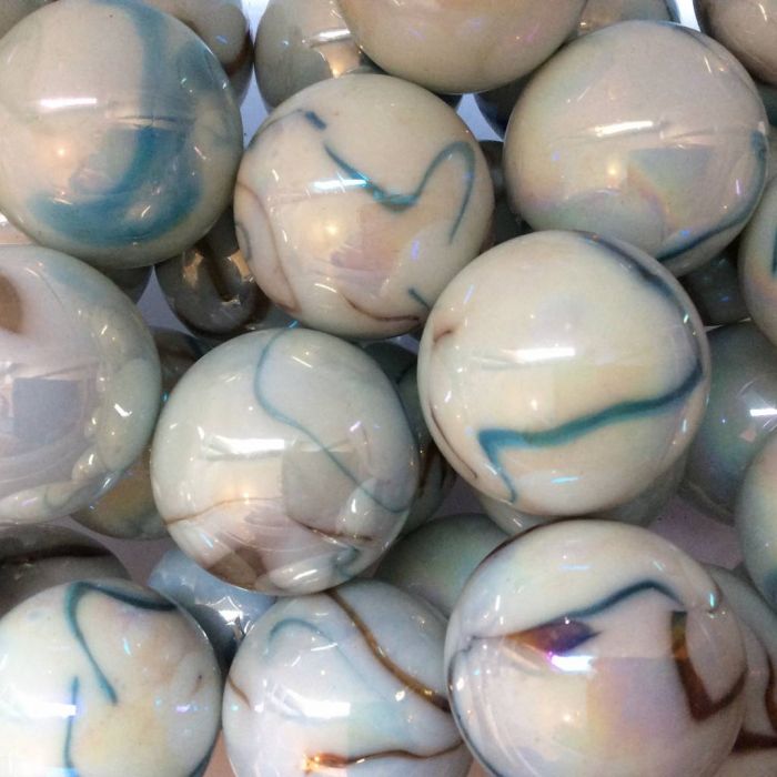 Ondoorschijnend witte knikker met lichtblauwe en zwarte strepen. Deze knikkers zijn afgewerkt met een parelmoerglans.