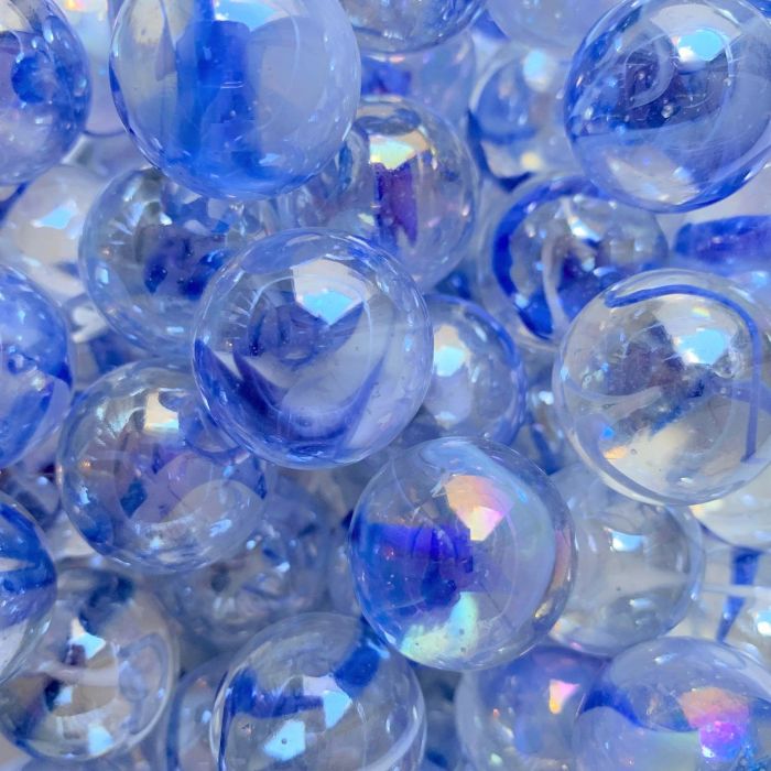 Transparante knikker afgewerkt met sierlijke witte en donkerblauwe slierten doorheen de knikker.