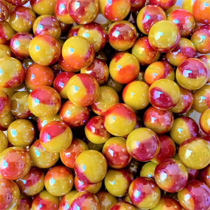 De zon is een ondoorschijnend gele knikker met een rode vlek op het oppervlak. Deze kleine knikkertjes zijn afgewerkt met een mooie parelmoerglans.